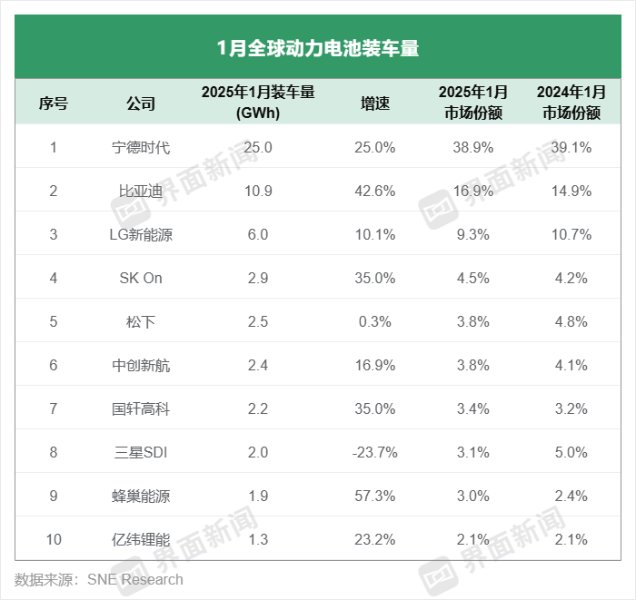 今年1月,稳坐全球第一的仍是宁德时代,该公司当动力电池装车量为25 GWh,同比增长25%,以38.9%的市场份额位居全球首位,相较于去年同期下滑了0.2个百分点。
