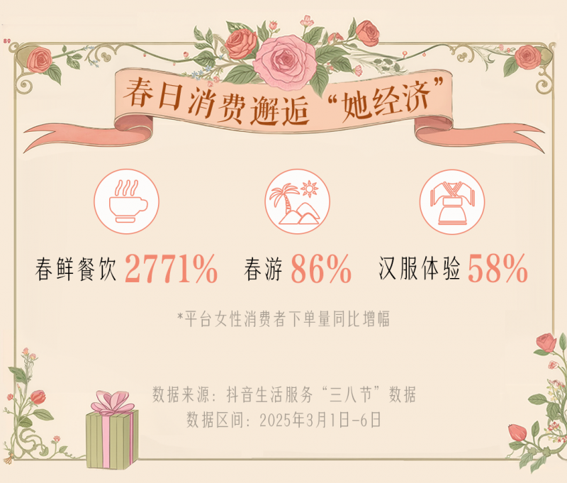 春日气温回暖,各类当季食材上市,唤起了大众对春游出行、品尝春鲜的热情。抖音生活服务数据显示,“三八”节前夕,平台女性消费者下单的春鲜餐饮团购订单量同比增长高达2771%,春游、汉服体验也分别同比增长了86%和58%。