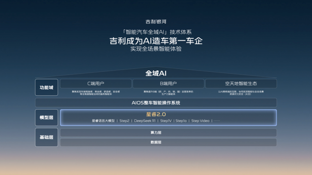 全域是指,目前吉利的GEA智能新能源架构、雷神EM-i超级电混、星睿AI云动力、AI银河精灵等前端AI科技成果,已应用于架构、动力、底盘、座舱等智能汽车全域。同时,吉利还将AI深入到产品研发、生产、售后服务等全链路环节,实现了全场景的智能体验。吉利称自己是“全球唯一完成全域AI智能化布局的车企”。