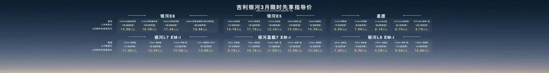 今年1月,吉利汽车单月销量达到26.6万辆,同比增长25%,其中,国内市场销量达23.9万辆,位居行业第一。但大体量的不只有吉利,这一点吉利也很清楚。从已公布的价格上看,搭载“千里浩瀚”的2025年银河E8的限时起售价为14.98万元,四驱顶配激光雷达版本的车型售价不超过20万元,显然是要在价格上也与宣传“智驾平权”的友商们一较高下。