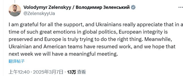 当地时间3月6日,乌克兰总统弗拉基米尔·泽连斯基在社交媒体发文宣布,乌克兰与美国团队已重启工作,“希望下周我们能展开有意义的会谈”。