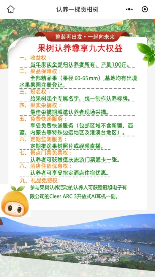2024年11月,为帮助贡柑搭建产销“快车道”,德庆县开展“认养一棵贡柑树,送一副耳机”活动,推动贡柑“未上市,已先热”,消费者以1399元的价格在小程序上认养一棵贡柑树的同时,当年可以获得100斤德庆贡柑精品果,同时获赠一副ARC3耳机。
