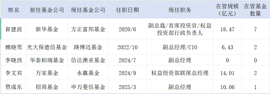 以崔建波为例,他曾在新华基金担任副总经理,自2020年6月加入方正富邦基金后,2020年9月-2021年12月担任公司首席投资官、权益投资部总经理(兼),2021年12月-2023年10月升任公司副总裁、首席投资官、权益投资部总经理(兼)、策略投资部总经理(兼),2023年12月至今担任公司副总裁、首席投资官、权益投资部行政负责人(兼)。截至目前,崔建波管理7只产品,合计规模为18.47亿元。