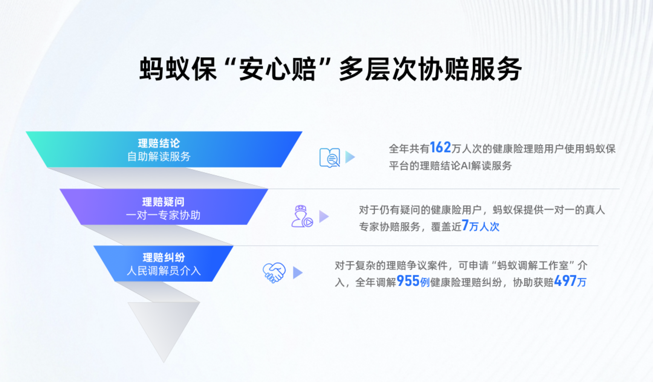 作为链接保司和用户的平台,从2022年开始,蚂蚁保和合作保司持续升级“安心赔”服务,承诺全程协赔和速度保障。目前,该服务已在健康险领域实现规模化覆盖,涵盖11家保险公司的85款产品。“安心赔”的全程协赔包括理赔结论AI解读、一对一真人专家协助和人民调解员三个层面,可全方位加强用户与保险公司之间沟通,化解理赔争议。