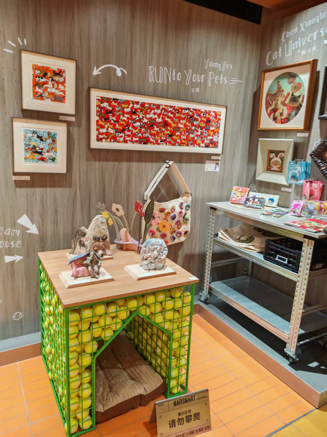 门店与一个艺术家MCN合作了宠物艺术品专区,此外还有挂满猫狗吧唧的痛包、用网球堆砌而成的狗窝……位于门店中心的玻璃门内,专门为高端客户群打造了奢侈品专区,Raphl Lauren的狗狗瓷盆、Boss和Tommy Hilfiger的宠物服装,品质感拉满。
