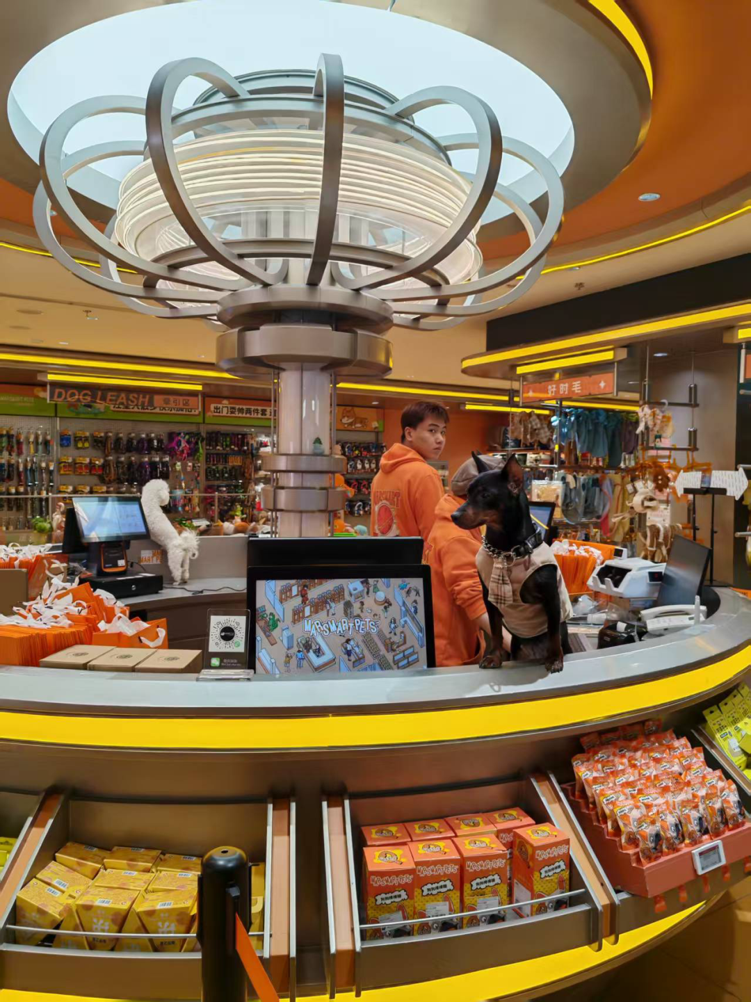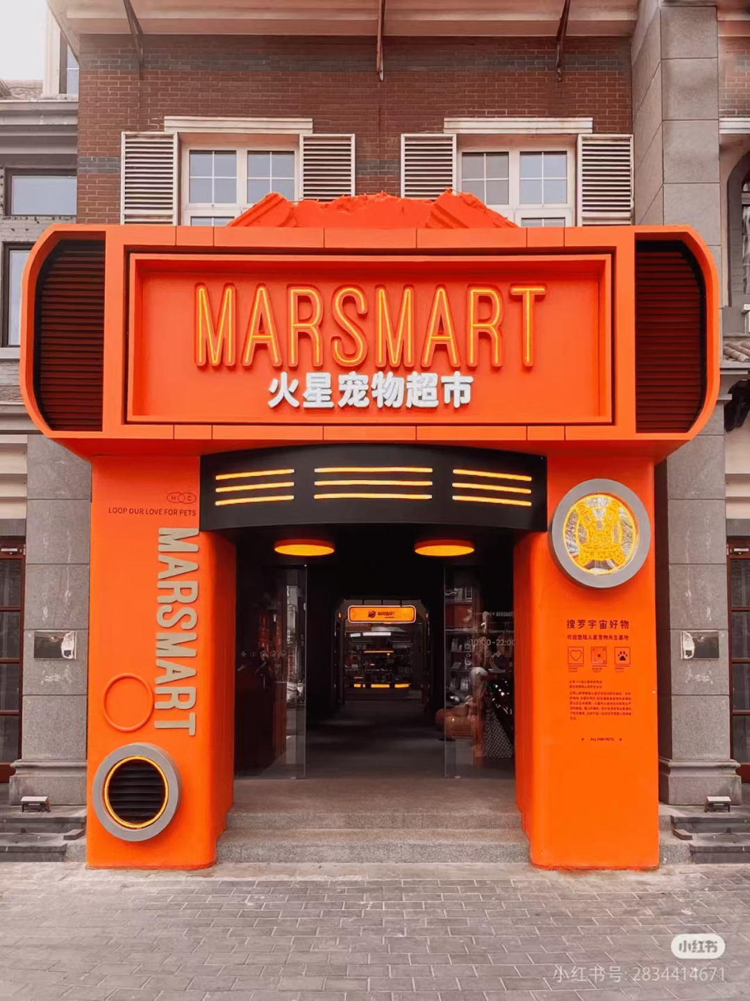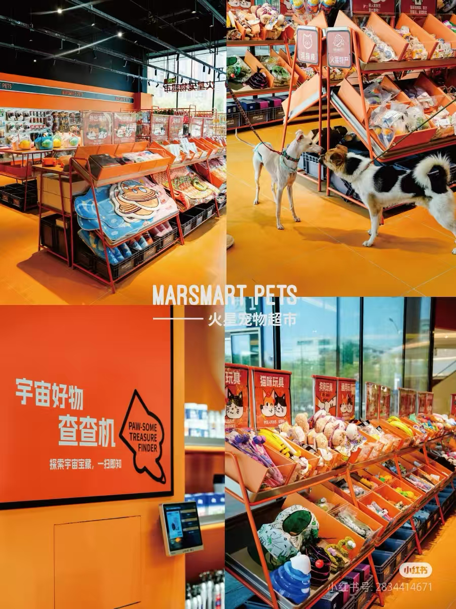 带有“MARSMART”的标志性LOGO,以橙色为主视觉色调,太空感为核心设计理念,未来感十足。收银台的台面上,端坐着一只黑色宾莎犬,它是今日店长。店门口贴心准备了宠物推车,消费者可以牵着狗,也可以选择将自家萌宠放置在手推车中,推着车在货架间穿梭。