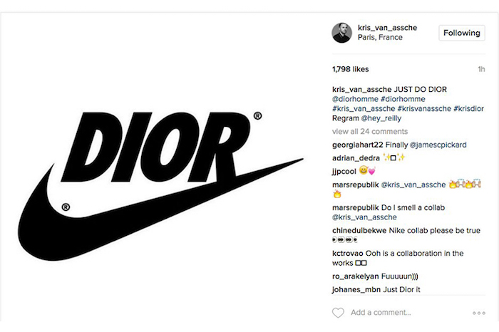 也许你对于前几星期一些媒体报道过的Dior可能要与Nike开展联袂合作的新闻还有印象。当时,Dior Homme创意总监Kris Van Assche在自己的Instagram账号发布了一张Dior和Nike商标混合在一起的图片,并配文“Just Do Dior”。一时间,令全球不少时尚媒体都以为这两个品牌要进行联袂合作的“绯闻”。