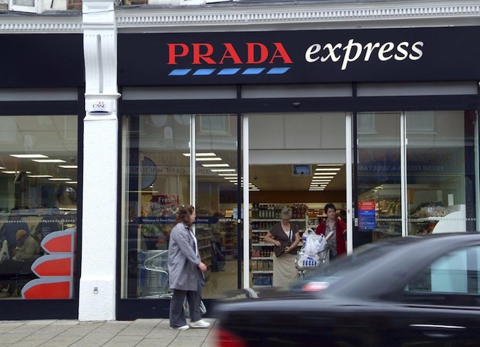 而除了单纯的将两个Logo混在一起,他也试过将Logo恶搞地融入一些生活场景。比如,题图中Chanel和麦当劳街头广告的融合。又比如下图中,Prada和乐购便利店的混合。