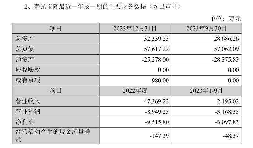 资料显示,寿光宝隆2022年度亏损9515.80万元,2023年1-9月份亏损金额3097.83万元。截至2022年底,寿光宝隆已经资不抵债,公司总资产3.23亿元,总负债5.76亿元,净资产为-2.53亿元。