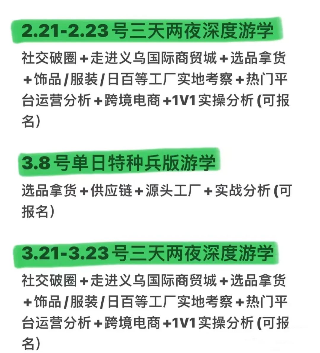 每天,他都会在群里发布精心设计的行程安排:“深度探访爆款工厂,揭秘财富密码”“解密跨境选品内幕,掌握选品精髓”“对接优质供应链,开启财富大门”。