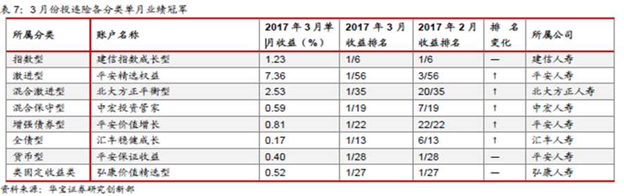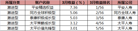 可见,3月表现靠前的投连险账户均属于激进型账户,激进型账户收益前5名亦是所有投连险账户收益前5名。表现最好的账户是平安人寿的平安精选权益,取得7.36%的正收益;而表现最好的公司则是太平人寿,旗下两只激进型账户——太平策略成长型和太平价值先锋型挤进前五,收益均在3%以上。