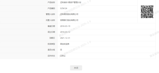 界面新闻查询中国基金业协会备案信息发现,迈科瑞毕1期目前备案状态显示为“已终止”。该产品成立于2018年3月19日,2021年12月31日到期,管理人为迈科期货,托管人为招商银行。