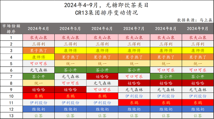 以前十名中处于腰部位置的茶小开为例,线下零售监测机构马上赢的数据显示,2023年12月至2024年11月,无糖即饮茶类目中前10名的市场份额排行榜中,茶小开排名第6。从2024年4-9月,无糖即饮茶类目中市场份额前13的集团排序变动情况看,茶小开的排位保持在6-7名之间。