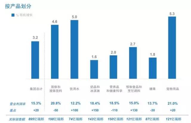 虽然这些重要投资的投入资金,没有详细的数据披露,但也能足以证明雀巢在健康科学上的投入规模巨大。在雀巢官网最新公布的2016年度业绩简报中,“营养品和健康科学”产品的2016年销售额(150.38亿瑞镑)占到集团总销售额的16.81%,仅次于“固体和液体饮料”产品的22.12%占比。