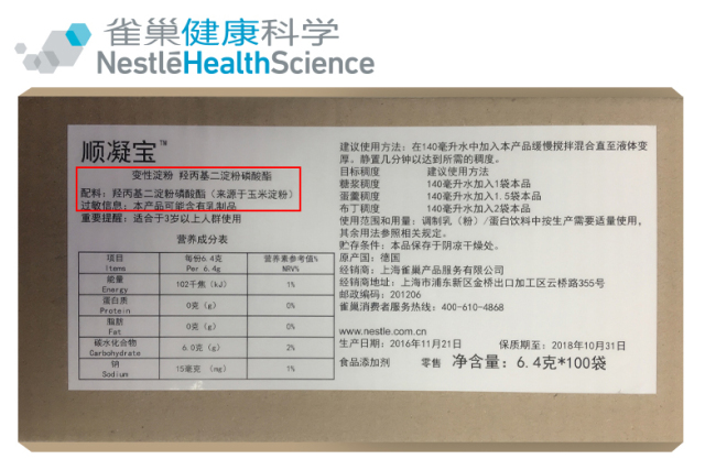 据雀巢介绍,该产品已在全球30多个国家推广,有着20余年的临床应用经验。官方说法是专为吞咽障碍患者提供的医用食物增稠剂。简言之,它就是变性淀粉(来源于玉米淀粉),取了一个这么接地气的产品名称。