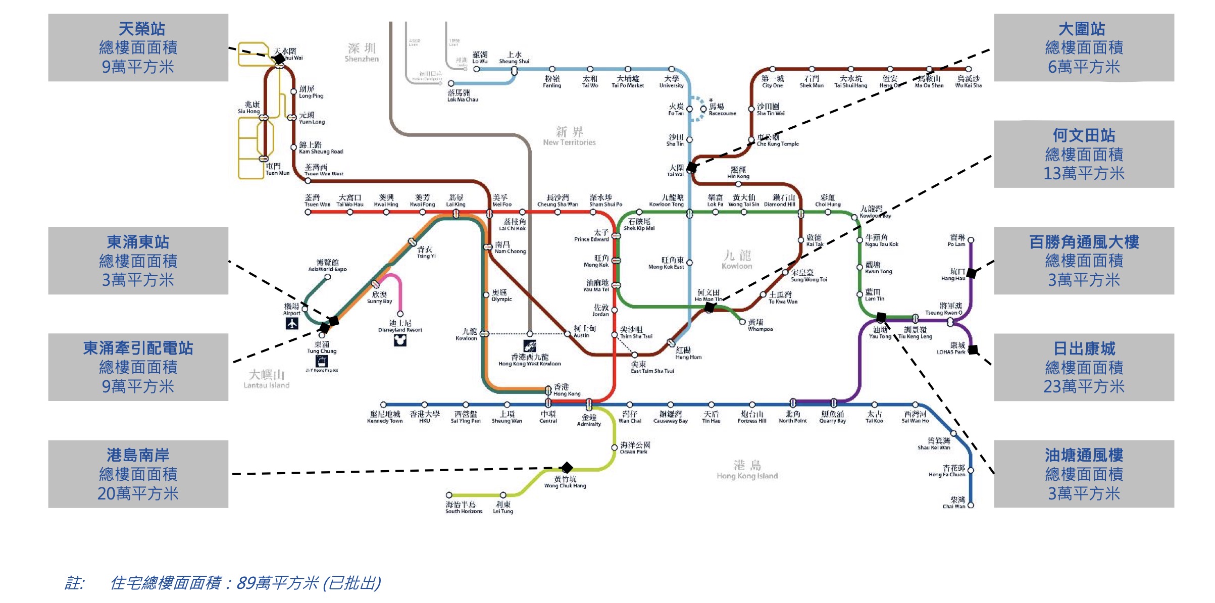 财报显示,目前港铁已批出土地储备面积为89万平方米,分布在何文田站、港岛南岸等多个地铁站点附近。据悉,未来12个月港铁还将有一大批住宅供应,其中包括东涌东站及屯门十六区车站的上盖物业。