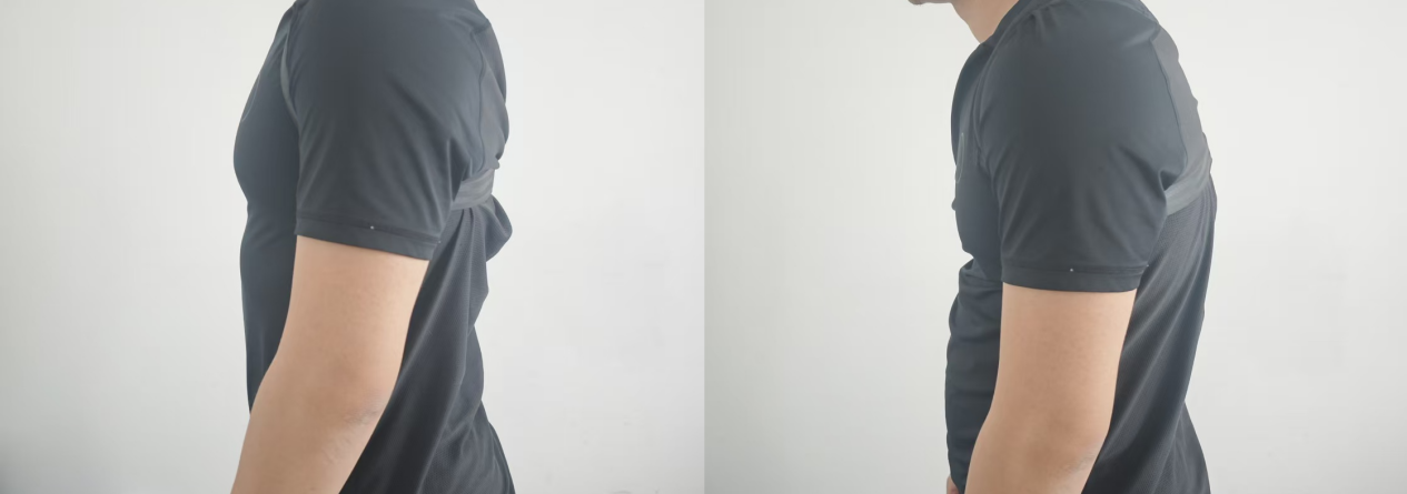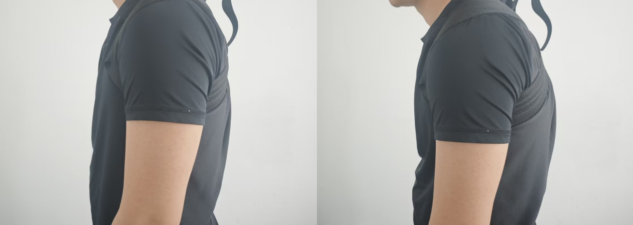 不过,虽然无法完全打开胸椎,但也还是有一定的拉力的,在具体使用过程中这个拉力却会让使用者不自觉地将头部向前伸开,处于一个头前引的姿态,在佩戴一个小时后,无法处于中立位的颈椎和酸痛的斜方肌,都让体验者感到十分难受。