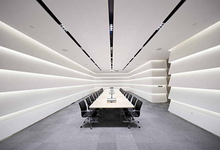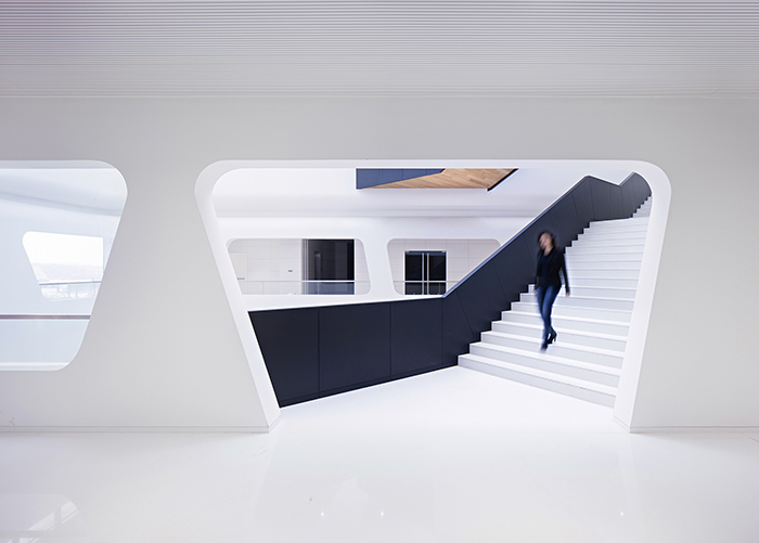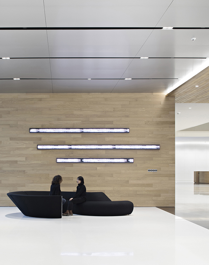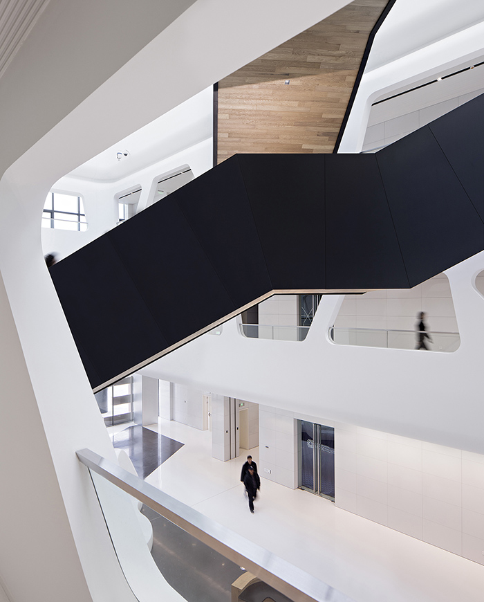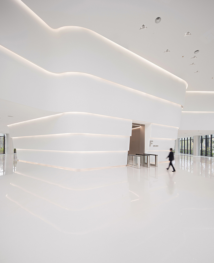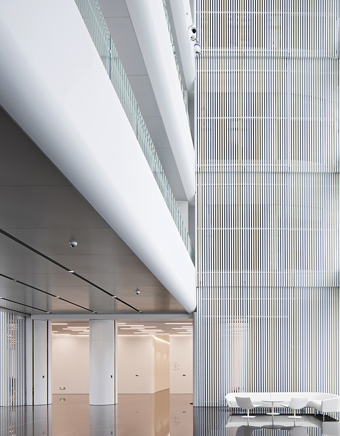 通常大厦的室内是由立面、顶面和地面组成的,每个面之间由直角连接,呈现相互独立而明确的关系。在这一项目中,汉诺森有意放弃了这种约定俗成的理解和处理方式,反而弱化立面与顶面及建筑物地面的边界,使它们自然过渡,让人们的视线不被阻断。
