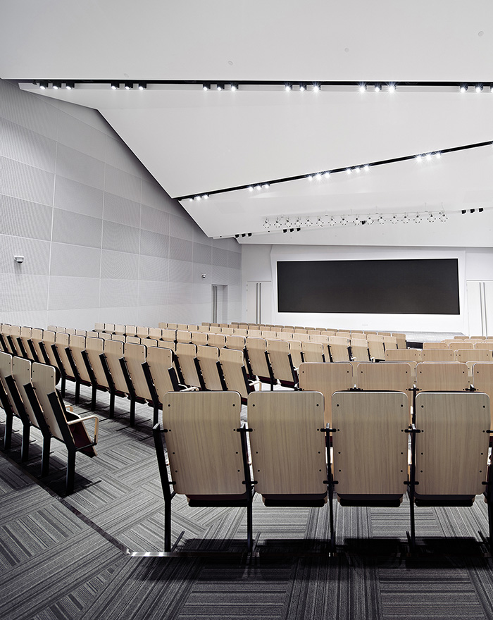 科学报告厅天花板和设备集成带采用折纸的形态处理,既很好的解决了声反射问题,又避免射灯光线衍射至播放主屏。座位以非对称倾斜方式排列,可方便人员进出与交流,并与顶部不规则形态设计做一对等呼应。