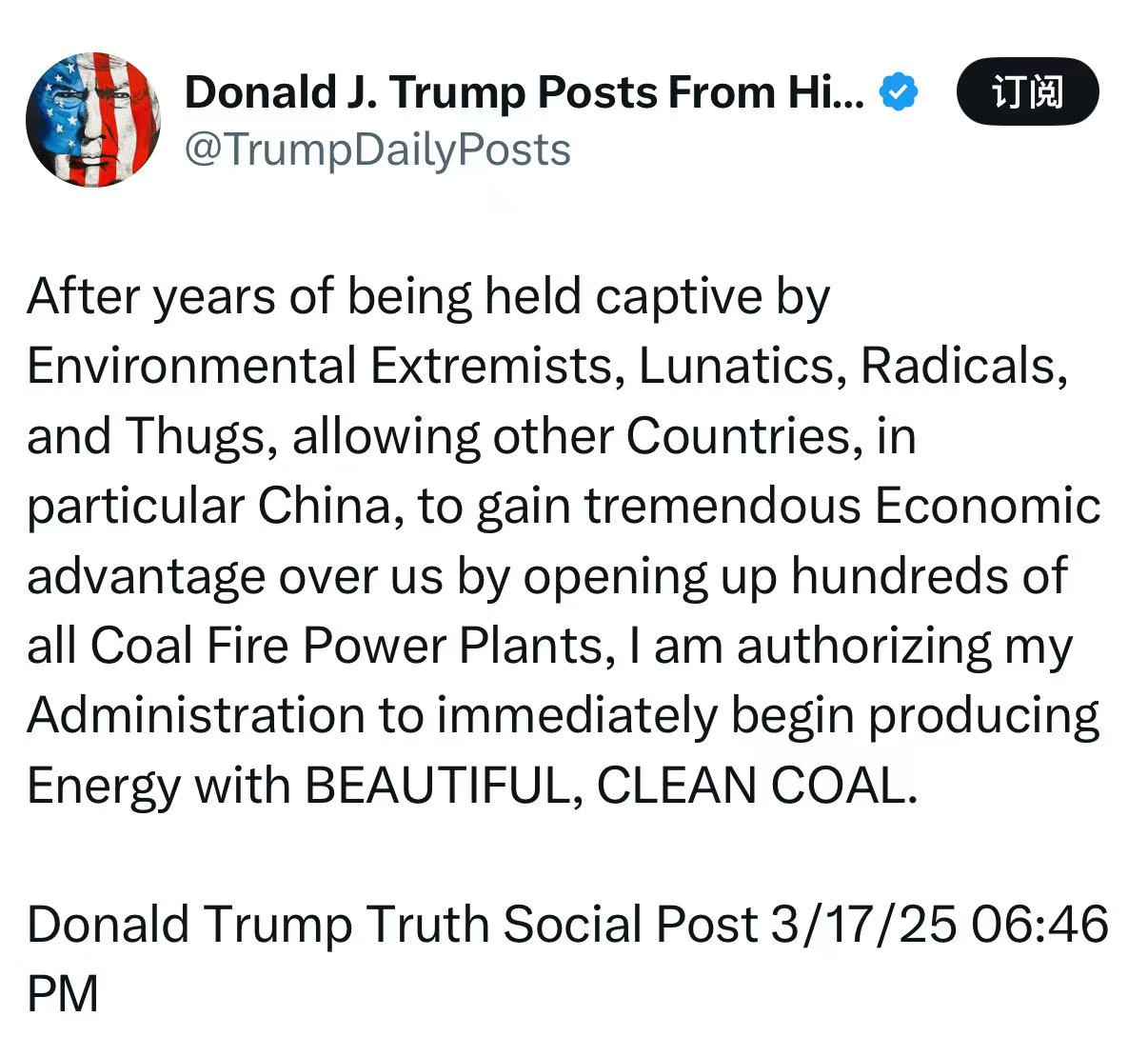 当地时间3月17日,美国总统特朗普在社交平台发布信息称,煤炭行业多年来“被环保极端分子、疯子、激进分子和暴徒所控制”,这使得其他国家得以通过开设更多燃煤电厂取得更大经济优势。