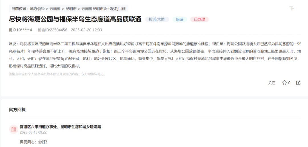 回复提到,根据官渡区农业农村局工作安排,六甲街道办事处计划于2025年内联合星海社区居委会、福保社区居委会,按照昆明市官渡区滇池沿岸重点村庄(福保村、新河村)乡村振兴项目要求,分步实施道路交通、村民住房及集体公房改造、人行步道建设及绿化景观建设等工程,全面提升福保半岛、星海半岛文化旅游形象。