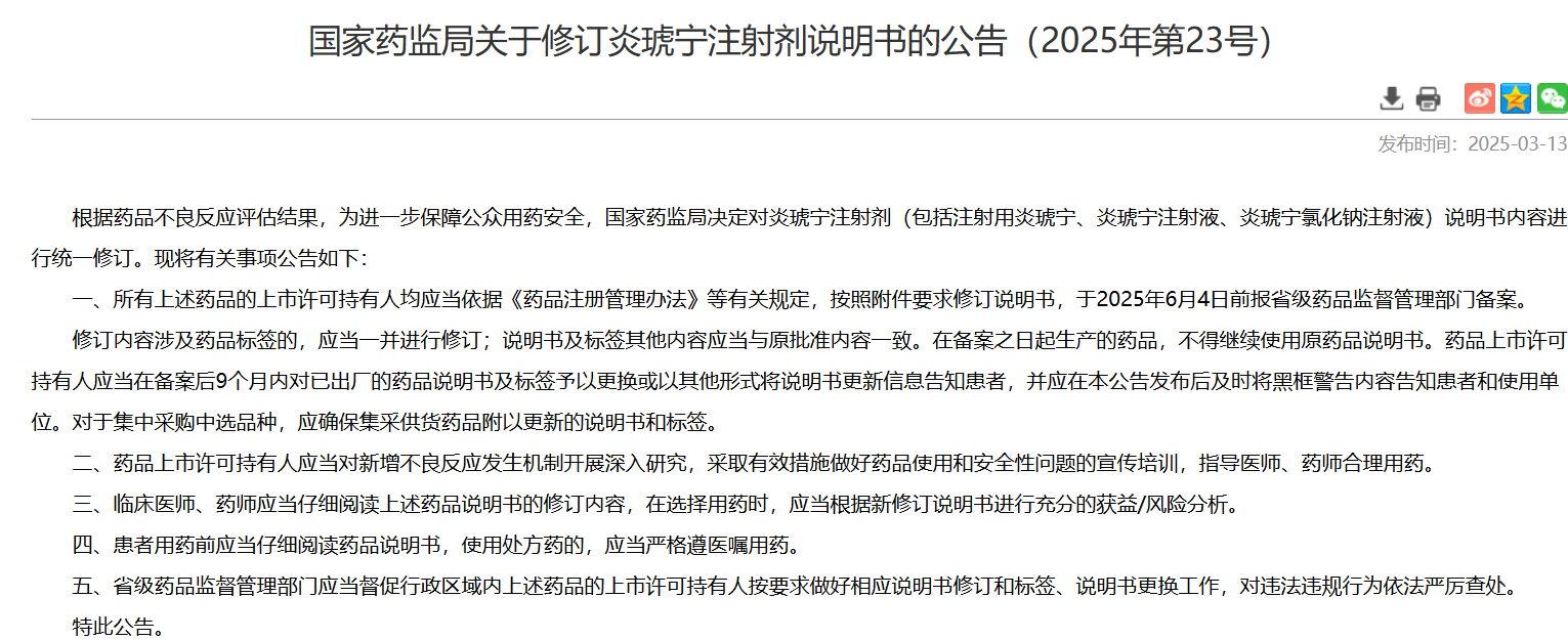 3月13日,国家药监局官网发布公告称,根据药品不良反应评估结果,决定对炎琥宁注射剂说明书内容进行统一修订。所有上述药品的上市许可持有人需要按照要求修订说明书,并且在2025年6月4日前报省级药品监督管理部门备案。