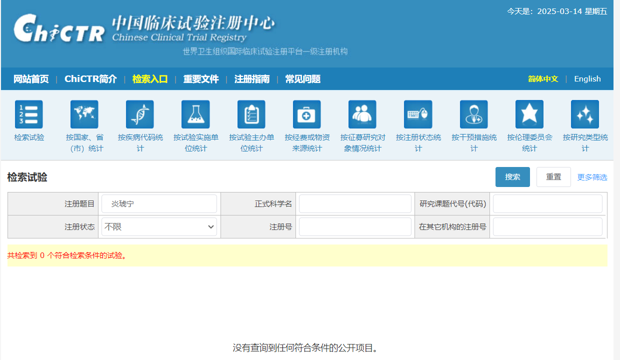 另外,在中国临床试验注册中心官网进行搜索,并未搜索到关于炎琥宁的临床试验项目。