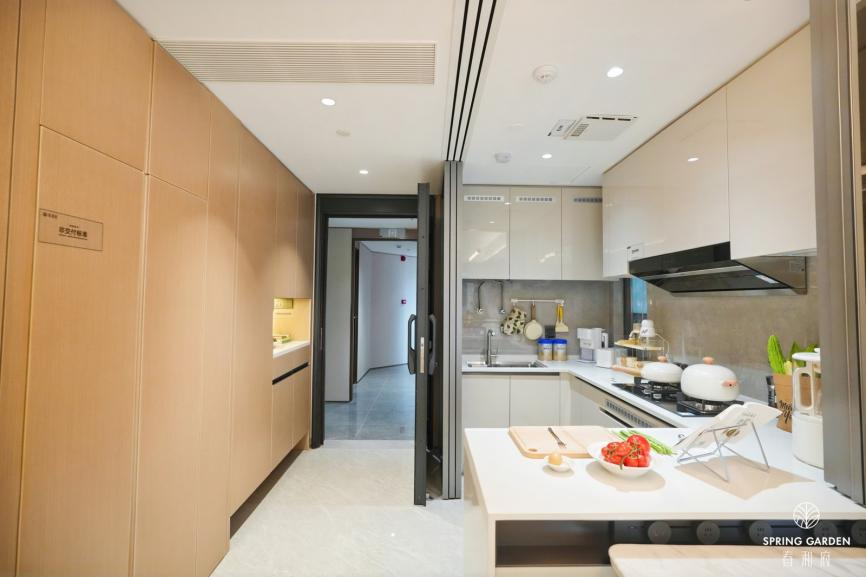 高度聚合客餐厅、厨房、阳台空间,打造陪伴式家庭超聚厅。让家庭的交流、互动、聚享不再受空间摒隔。满足对居住空间公域功能化和社交互动的双重需求。