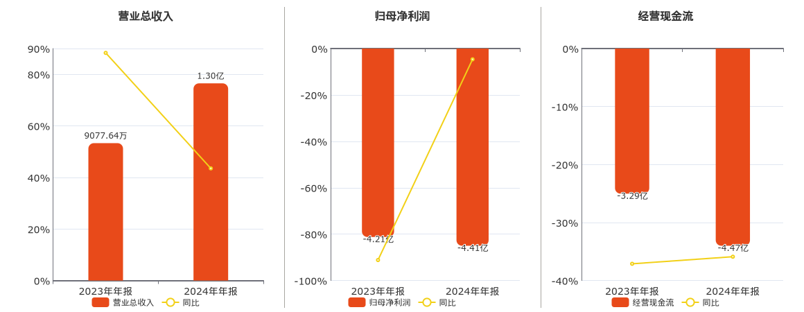 公司营业总收入为1.30亿元。归母净利润为-4.41亿元,较去年同报告期归母净利润减少1959.68万元。经营活动现金净流入为-4.47亿元,较去年同报告期经营活动现金净流入减少1.18亿元。