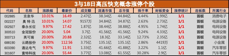 3月18日,英可瑞(300713)、奥特迅(002227)、京泉华(002885)、泰永长征(泰永长征)等涨停,天迈科技(300807)、森源电气(002358)、永贵电器(300351)等涨跟涨。