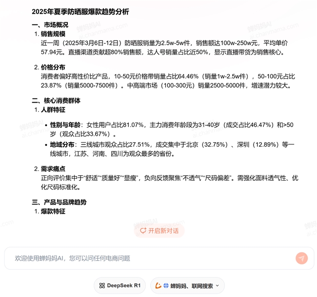 ▲向蝉妈妈AI询问夏季防晒服爆款趋势