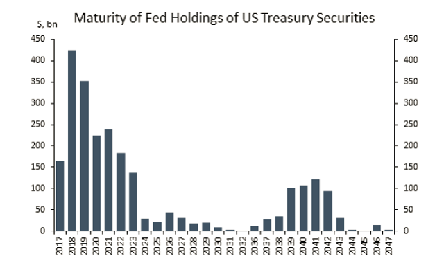 与其他年份相比,有更多国债将在2018年到期。从更长的时间范围来看,近一半的国债会在2020年之前到期,绝大部分MBS会在2039年以后到期。面对到期资产,美联储此前一般会通过再投资来维持其资产负债表的规模不变。