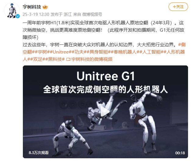 3月19日,@宇树科技 更新视频,标题为“全球首次完成侧空翻的人形机器人:宇树G1”。宇树科技表示,一周年前宇树H1(1.8米)实现全球首次电驱人形机器人原地空翻(2024年3月)。这次稍微抽空,挑战更高难度原地侧空翻。视频中,宇树G1机器人在完成侧空翻动作后保持平衡。