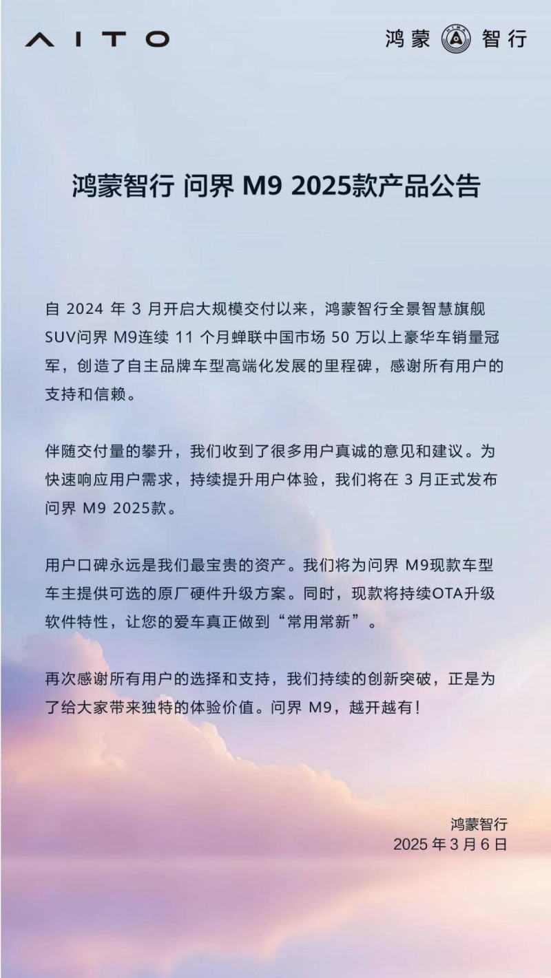 3月20日,全景智慧旗舰SUV问界M9 2025款将正式上市。此前,在预售开启一周内这款新车拿下了30000台订单。而在新款亮相的同时,问界开创性为现款车主推出原厂硬件升级方案,以独具匠心的创新举措和无微不至的服务,兑现品牌对用户全心全意服务的承诺。