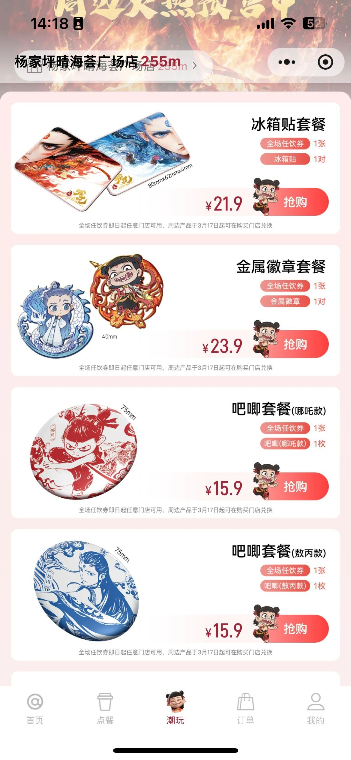 所有套餐的咖啡券只含一杯自选咖啡,三个月内核销即可。周边选择上充分给予消费者选择空间,哪吒、敖丙两位主角的冰箱贴,共21.9元;两款浮雕镂空徽章,共计23.9元;75mm的马口铁吧唧,六款自选一种,15.9元。