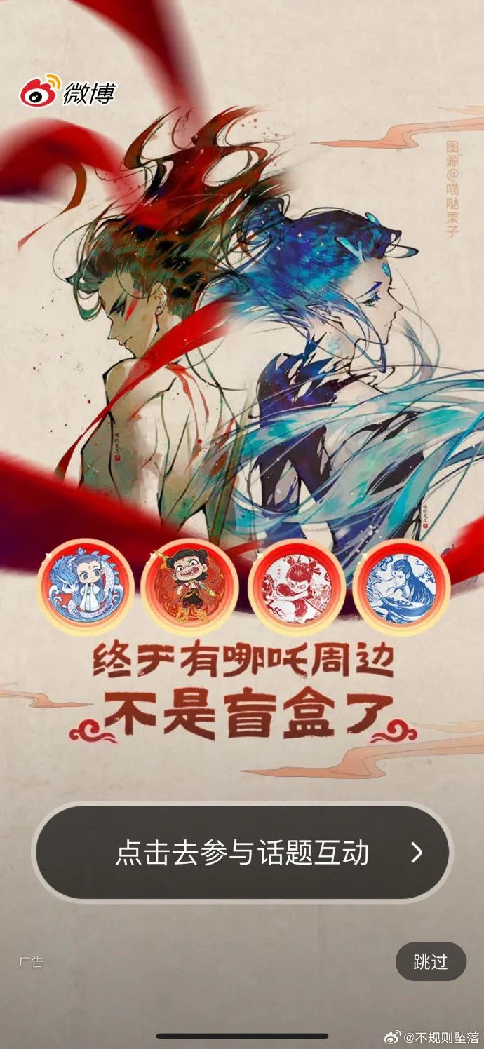 联名套餐将高性价比拉满,库迪宣传时同样给足排面。不仅小红书、微博都有开屏广告,其中宣传图甚至不乏同人作品,并附上“终于有哪吒周边不是盲盒了”的宣传语。大V推荐、营销号安利与话题造势等常规联名宣传操作,也都悉数安排。