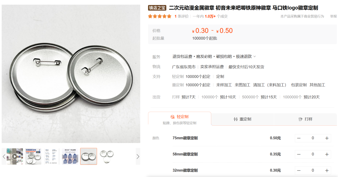 以15.9元的吧唧套餐为例。1688相关工厂报价,生产数量过千的75mm反光白吧唧单价在1.5元左右,大批量生产的成本可压缩到1元以下。亚克力冰箱贴、金属徽章单价更高,却也与吧唧类似,生产数量越多,单价越低。