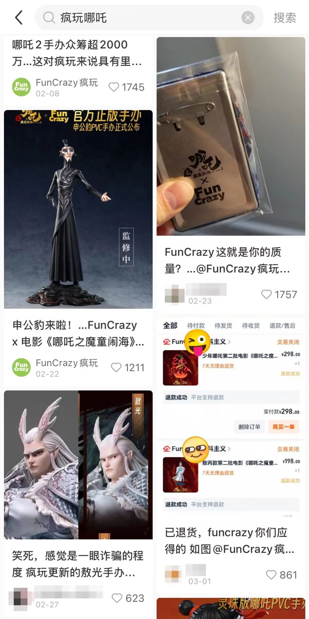相较前作,《哪吒2》的衍生授权更加前置,各大品牌知晓要抓住观众消费热情最高涨的时期,“FunCrazy塑料主义”便是其中之一。这家曾经的小众模玩品牌,首次进行大规模衍生开发,其周边众筹成绩十分可观,然而如今在社交媒体搜索相关讨论,手办实物被贴上“避雷”标签,单领的75mm白瓷底吧唧定价20元、有人吐槽“不如5元自印”,就连店铺售后、客服态度等问题,也被消费者的负面情绪占据。