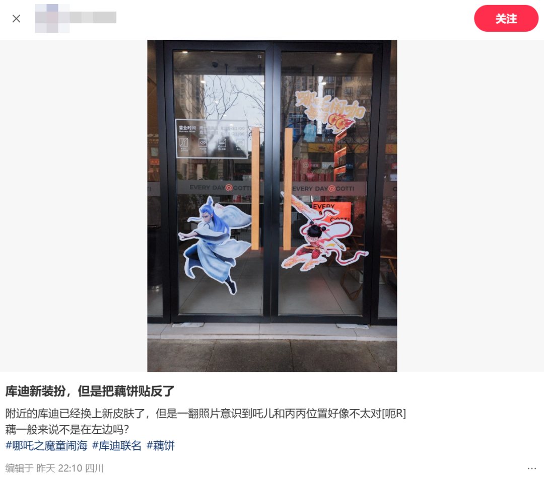 还有网友随意提到某店铺的哪吒和敖丙的海报左右贴反,被大数据推送给了店员,店员当即表示迅速修正。就算可能只有CP粉们在意这种细节,但库迪主打“听劝”。