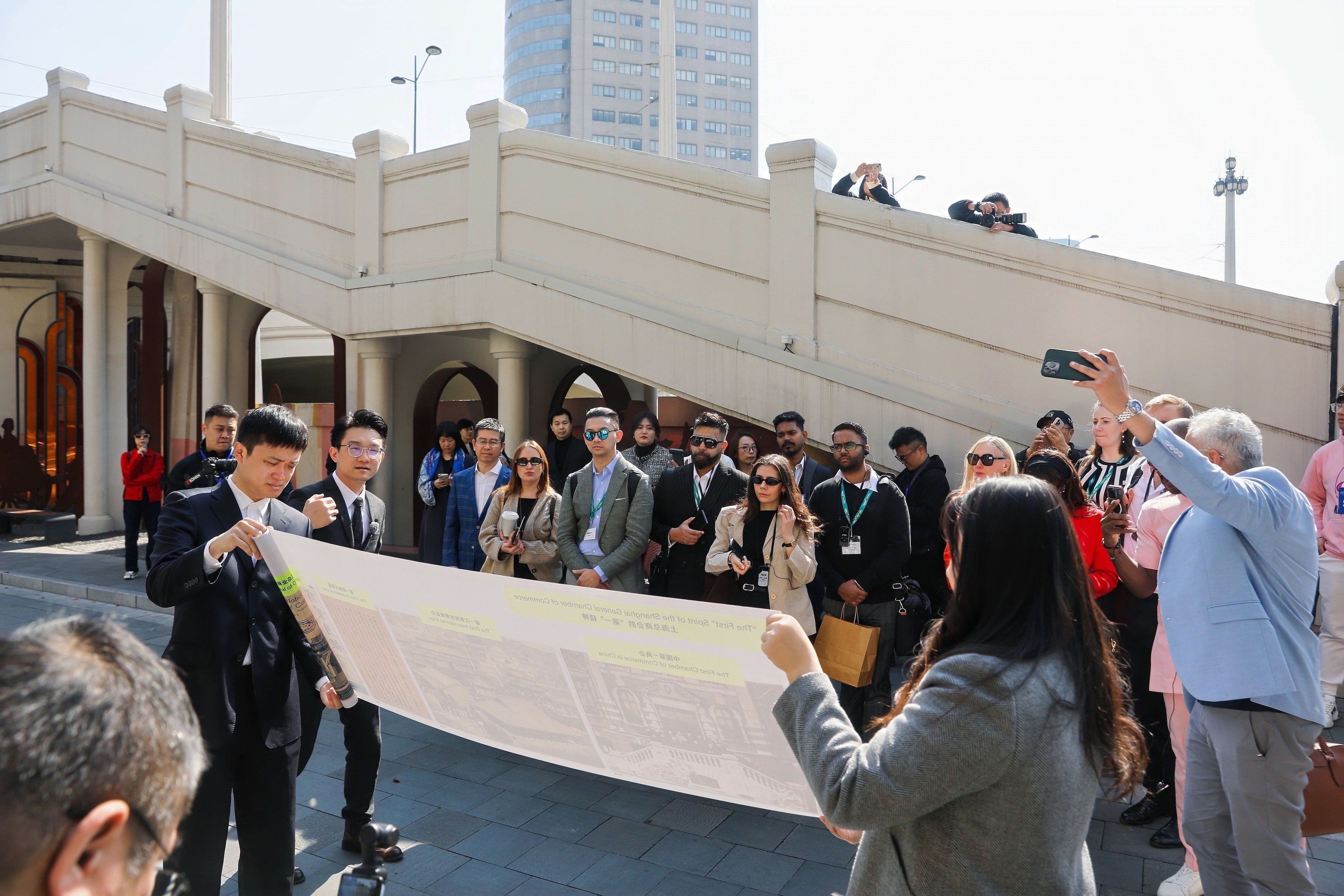 从百年历史的上海总商会、天后宫,到普利茨克奖得主英国诺曼·福斯特事务所设计的苏河湾中心和历经40年治理而复清的苏州河,外宾们在苏州河畔来了一场Citywalk,深入探寻苏河湾区域的历史与人文。
