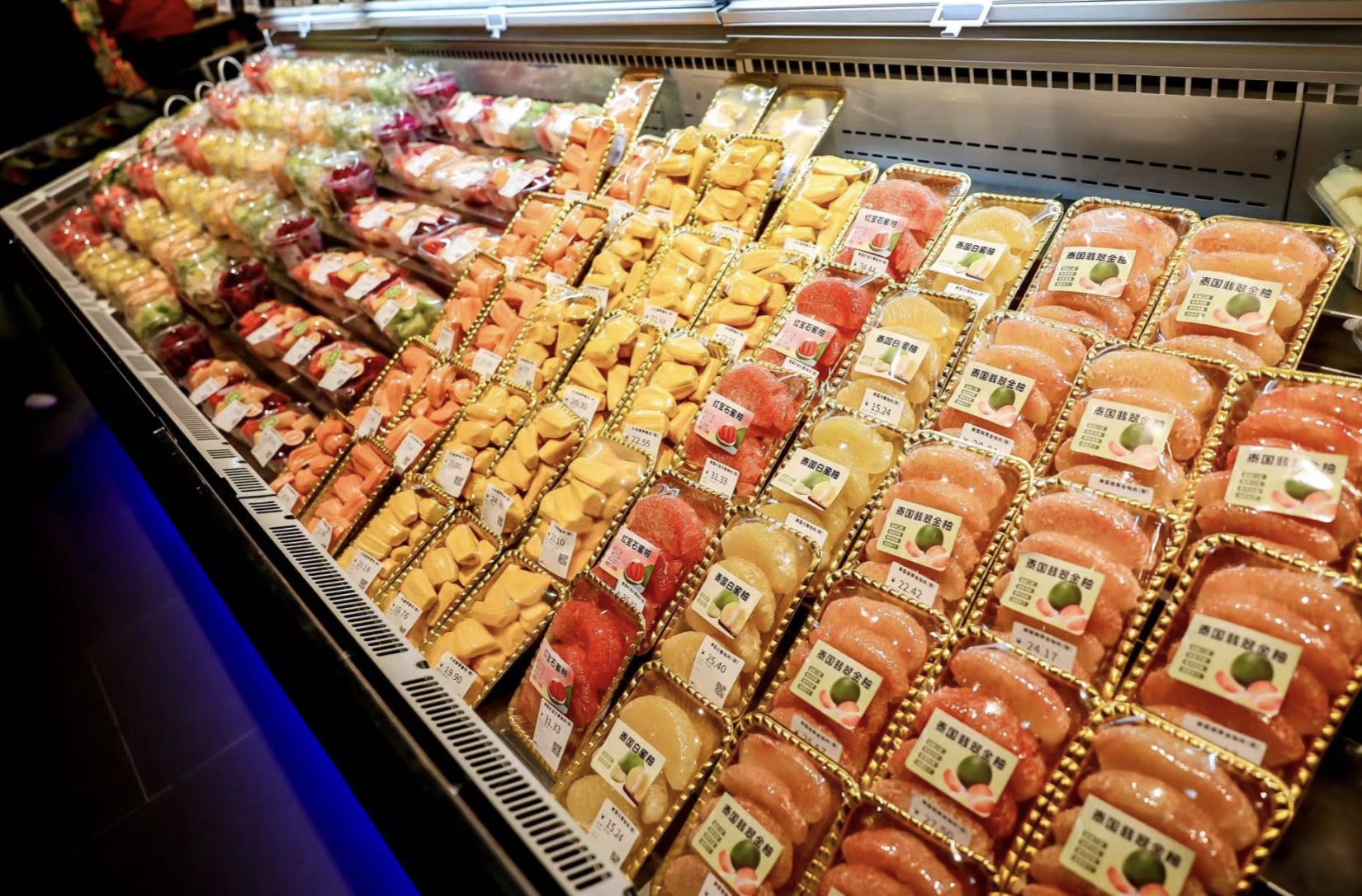 但为了做出一些差异化,物美没有刻意将自有品牌商品做成堆头重点销售,也没有像永辉一样开发与胖东来类似的洗衣液、洗脸巾、燕麦片等热门产品,而是尽可能加大烘焙、熟食、水果、生鲜等区域与胖东来的相似度,提供相似产品与服务。