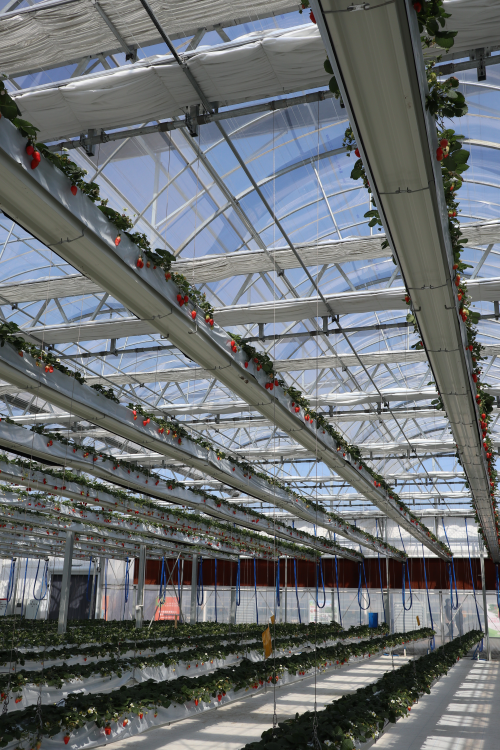 在盐城市盐都现代农业产业示范园的“空中草莓”基地,界面新闻记者看到,一排排草莓架离地1米到4米不等,与传统的种植方式有很大不同。据工作人员介绍,草莓架每日会轮换升降,与传统方式相比,可以更精准控制草莓接受光照的时间。