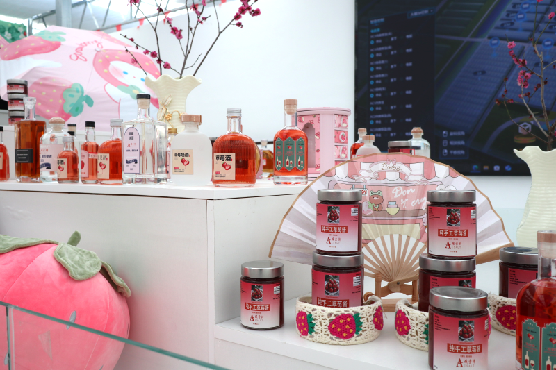 在示范园的产品售卖区,一瓶瓶草莓烧酒吸引了很多人驻足。这些产品来自埃索特酒业(江苏盐城)有限公司,董事长郝淑红告诉界面新闻,在本次大会上,公司推出了一批漂亮精致,同时又好喝好吃的草莓酒和草莓果酱,收到了积极的反馈。