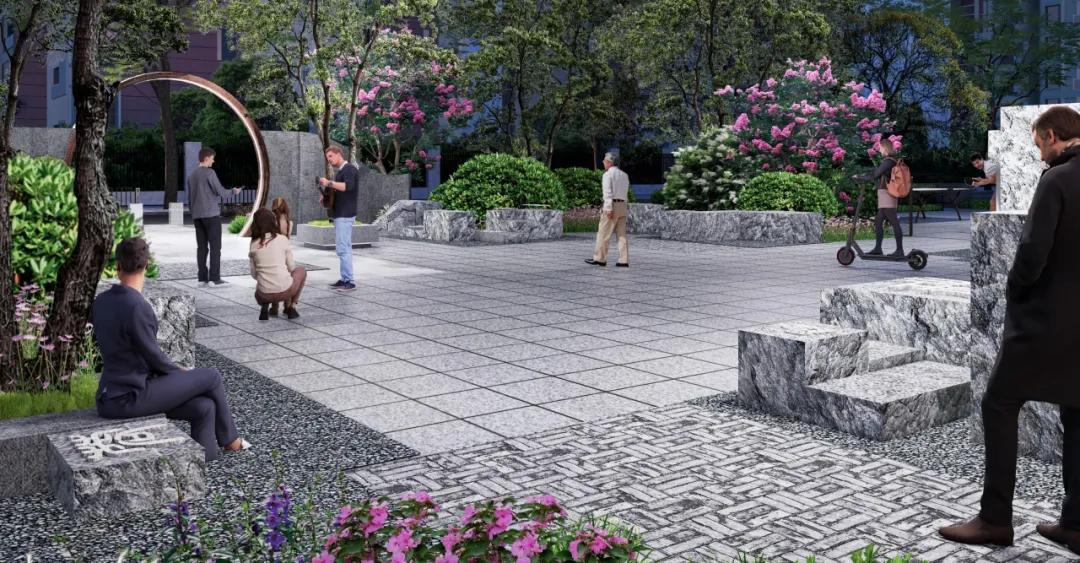 为进一步提升慢行体验,助力花园城市建设,沿街商业区将利用高差增加绿化带、优化人行道布局,并在街角打造绿化空间、拓宽步行区域,同时增加灯光效果,打造出绿意盎然的步行空间。街道政务服务中心门前利用花、草、石、木等自然元素组成休闲空间,松榆西里社区则通过街角绿化形成活动广场,并用景观的方式还原潘家园早期商业交易场景,让街角既有绿意又有“文化味儿”。