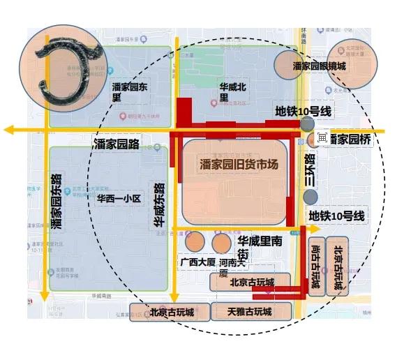 潘家园传统文化示范街区以“穿越时空的博物馆”为概念,旨在打造可逛、可赏、可触摸的文化街区,即“没有围墙的博物馆”。该街区涉及东三环南路等4个重点路段及周边区域,涵盖潘家园旧货市场、北京古玩城、尚古古玩城、天雅古玩城等文化设施,总面积约2.59万平方米,整体形状宛如古老玉龙,独具韵味。