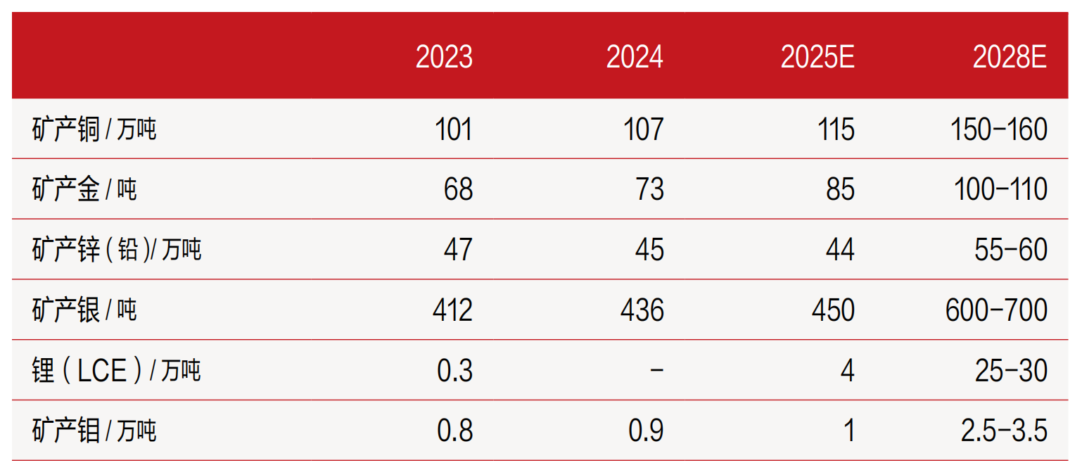 针对2025年的产量计划,紫金矿业披露称,将实现矿产铜115万吨、矿产金85吨、矿产锌(铅)44万吨、当量碳酸锂4万吨、矿产银450吨、矿产钼1万吨。