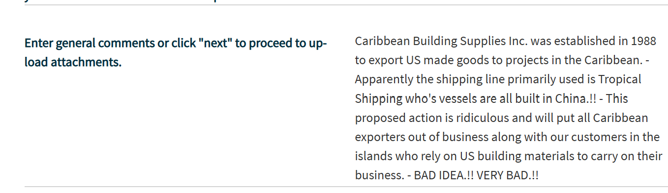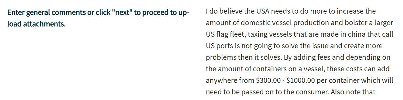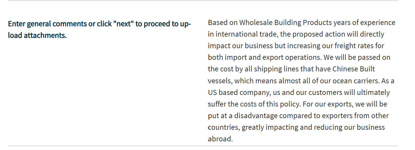 以上均为USTR就拟议限制措施征集所得的公众意见。在USTR官网,类似的评论还有很多。它们有的来自美国本土制造企业,有的来自跨境贸易商,还有的来自当地的集装箱码头等等。