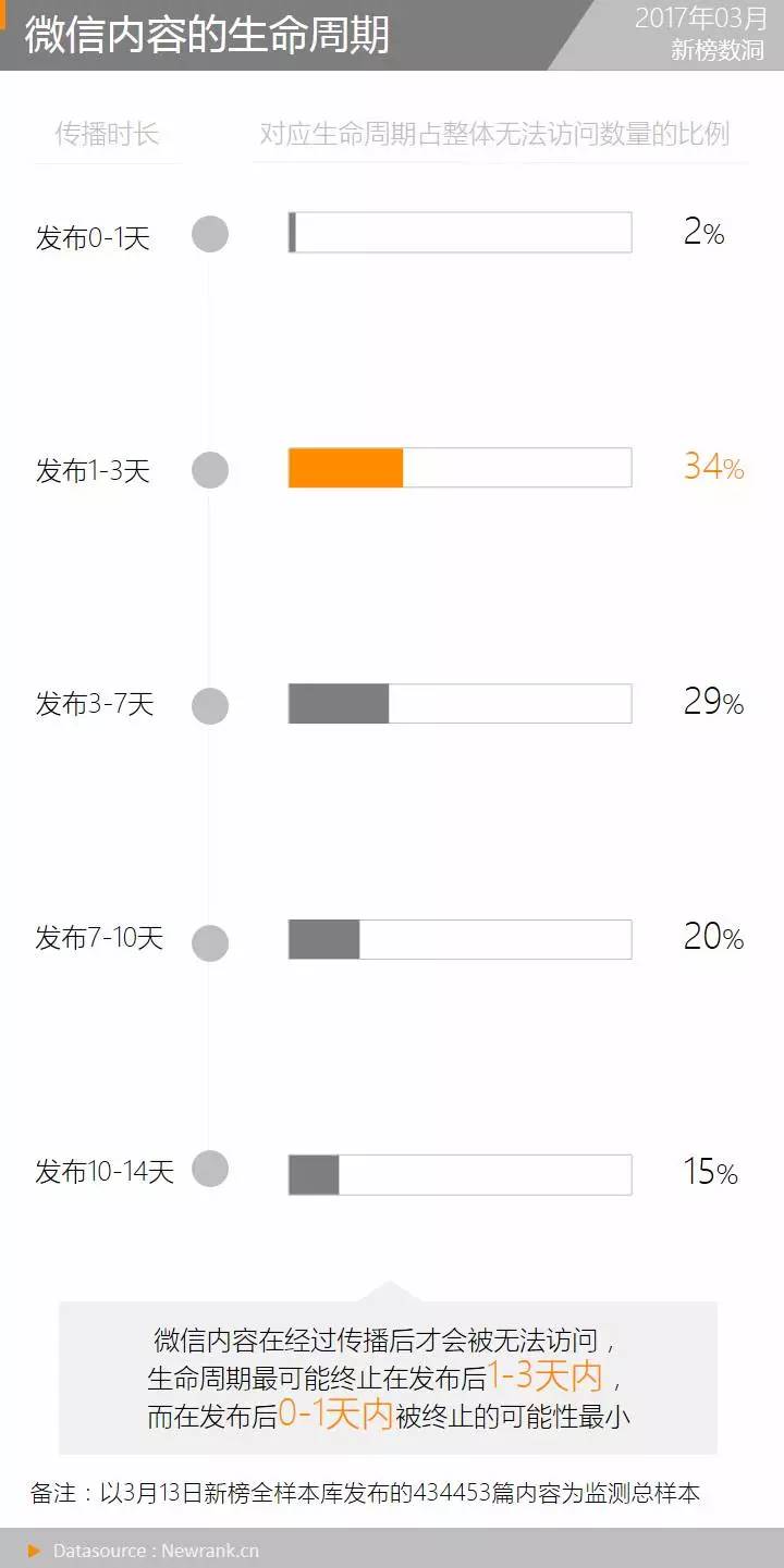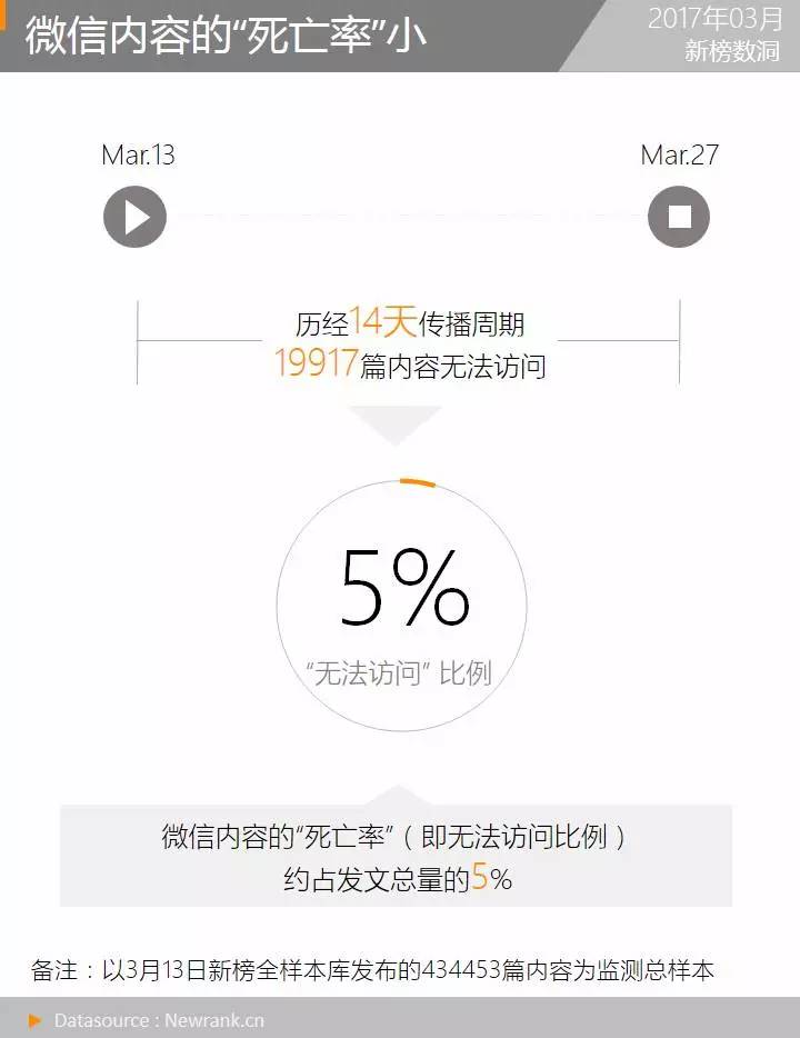 3月13日,新榜共计监测发文434453篇内容,并在随后的14天对其进行指定时间点的跟踪监测。截止到3月27日,监测样本中共计有19917篇内容无法访问,约占发布内容的5%。说明微信中大部分内容的生命周期长于两周。