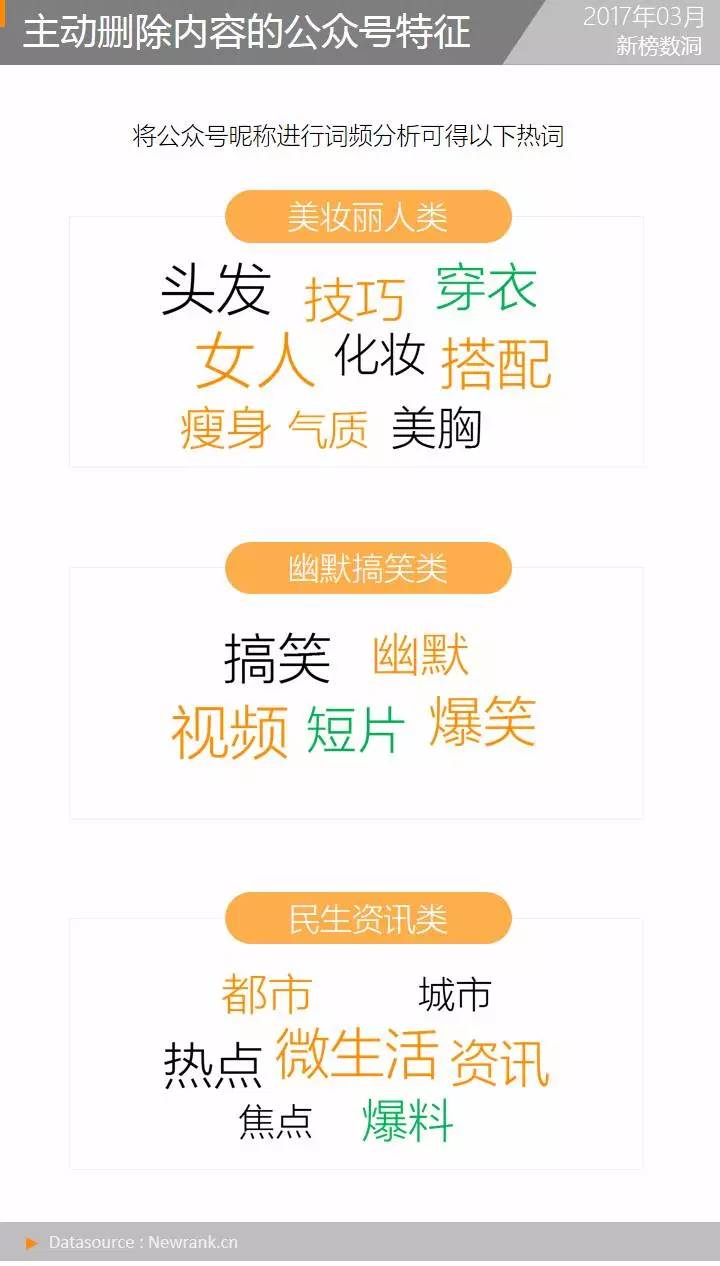 新榜重点研究那些主动停止传播的内容,希望从样本中找到一些共同的特征。从公众号的角度来说,上述被运营者删除的内容来源于6371个公众号,将这些公众号的昵称进行词频统计,发现美妆丽人类、幽默搞笑类以及民生资讯类是该阵营的重要组成部分。