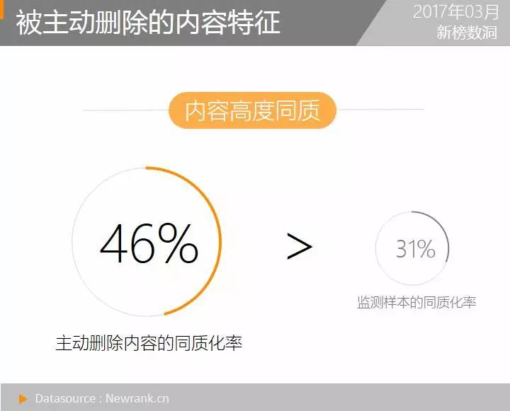假设当标题一致时,它们发布的内容则认为一致,那么19117篇内容共来自于10319篇不同的内容,也就是说,这些被主动删除的内容同质化率高达46%(远高于全样本31%的同质化率);